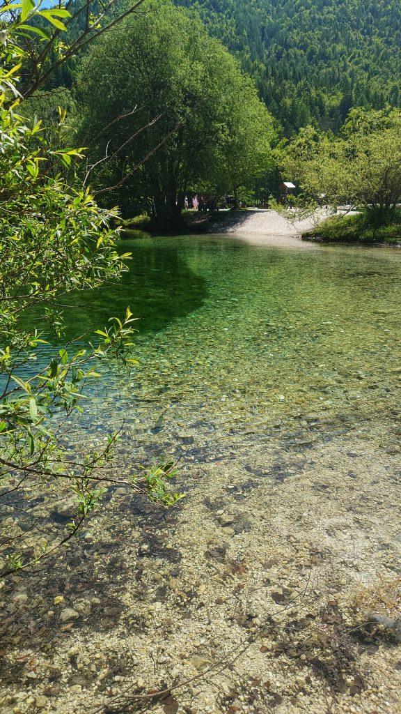 Unser letzter See befindet sich in der Nähe von Kranjska Gora am Rande der Julischen Alpen, nahe dem Vršič-Pass. Der grüne und glasklare Jasna See (Jezero Jasna). Jasna bedeutet übrigens klar. Und das auch zurecht, denn das Wasser ist eben glasklar! Das Wasser kommt vom Fluss Pišnica und da es sich um Alpenwasser handelt, ist der See meist kühl. Im Sommer perfekt zum Abkühlen – im Mai aber noch so kalt, dass du meinen größten Respekt verdienst, solltest du dich komplett hineinwagen.